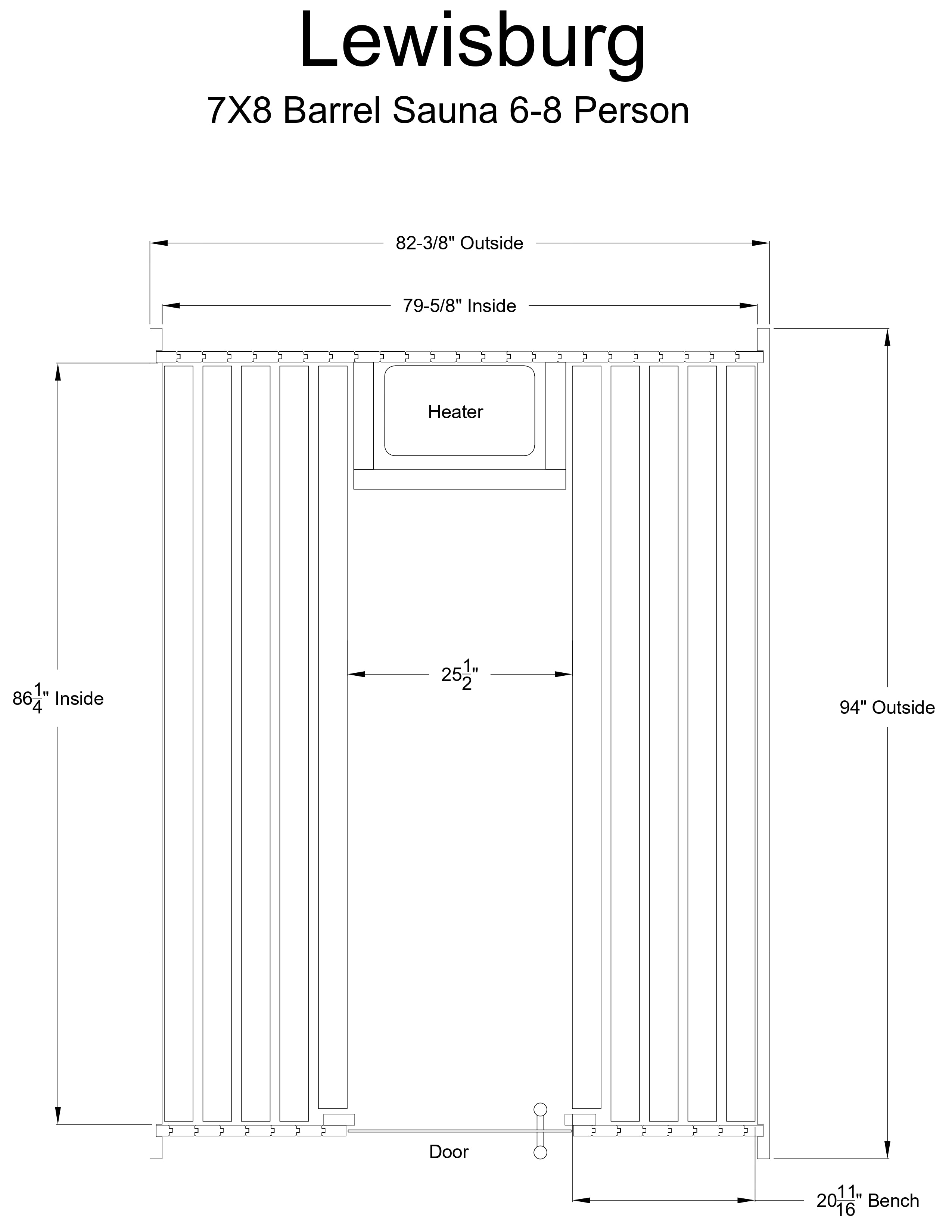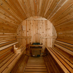 The 7' x 8' Lewisburg Sauna offers extra space to stretch out, with a larger diameter than standard barrel saunas. Choose a wood-burning heater or the Harvia 8kW electric heater, which heats to 180ºF for a steamy, relaxing session.